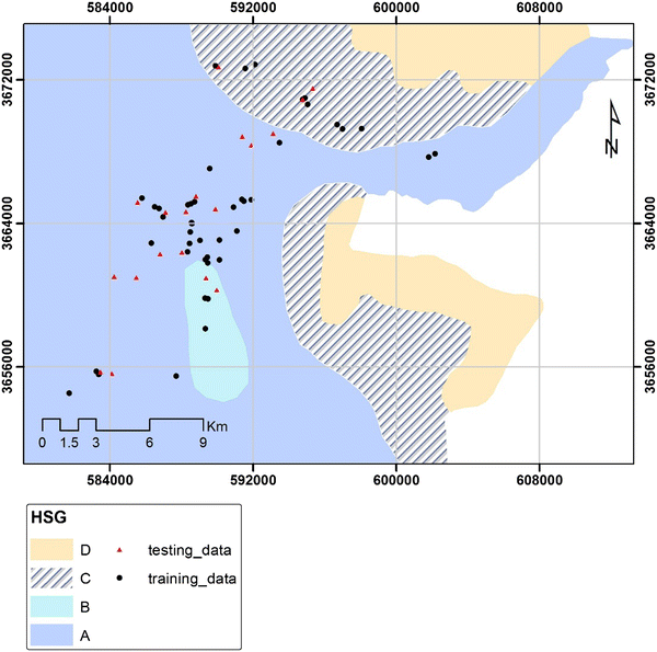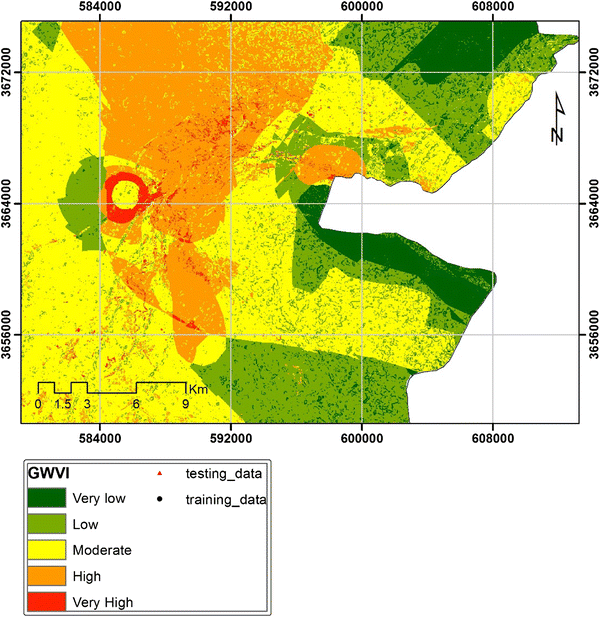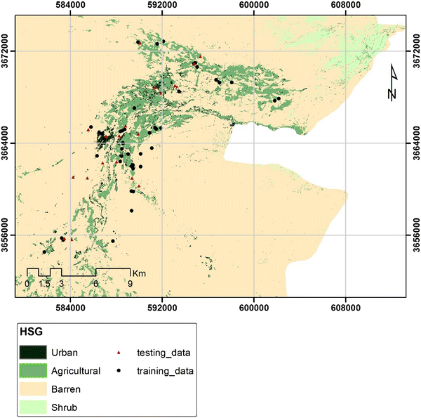Groundwater is a primary life-giving resource. Its availability is an essential component in socio-economic development, human evolution, poverty reduction, and ecological diversity. Groundwater often provides a reliable source of water where surface water is unavailable or inadequate. Thus, it is essential to manage groundwater resources in sustainable mode to ensure its quality and quantity for a long period. To properly manage and protect groundwater reservoirs, especially shallow water-bearing layers, it is necessary to delineate areas where groundwater may be more vulnerable to pollution. Analysis of aquifer vulnerability is an important tool for groundwater management and provides basic information for facilitating proper planning and protection of groundwater resources (Majandang and Sarapirome 2013). The term vulnerability is defined as the degree to which human or environmental systems are likely to experience harm due to perturbation of stress, and can be identified for a specified system, hazard, or group of hazards (Popescu et al. 2008). In groundwater hydrology, vulnerability assessments typically describe the susceptibility of the water table, a particular aquifer, or water well to contaminants that can reduce the groundwater quality (Liggett and Talwar 2009). Two terms are used to describe groundwater vulnerability: intrinsic and specific. Intrinsic vulnerability is the natural susceptibility to contamination based on the physical characteristics of the environment. On the other hand, specific vulnerability is defined as an accounting for the transport properties of a particular contaminant or a group of contaminants through the subsurface. In general, three different methods can be used to assess groundwater vulnerability namely, index and overly, statistical, and process-based methods. In overly and index methods, factors which are believed to have an influence on the movement of pollutants such as geology, soil, slope, hydraulic conductivity are mapped. These factors are assigned weights and rates depending on their importance on controlling pollutants movement. The resultant maps are linearly summed to produce a map of vulnerability index of an area. The groundwater vulnerability produced by such methods is generally qualitative and relative. Several overly and index methods have been developed. The most common are the DRASTIC (Aller et al. 1987), the GOD (Foster 1987), the AVI (Van Stempvoort et al. 1993), the SINTACS (Civita 1994), and the EPIK (Doerfliger and Zwahlen 1997). The process-based models use simulation models to estimate time of travel, concentration of contaminant, and duration of contamination to quantify areas of high and low susceptibility to pollution. Some of these models are designed to simulate migration of contaminants through unsaturated zone, saturated zone, and unsaturated–saturated zones. Process-based models are not commonly used to assess vulnerability because they are constrained by data shortage, computational difficulty, and the expertise required to implement them. Statistical methods are used to quantify the risk of groundwater pollution by determining the statistical dependence between observed contamination and observed land uses that are potential source of contamination (Harter and Walker 2001). Once the statistical relationship is attained, the model can be used to predict the probability of contamination risk. The main advantage of this method is that the statistical significance can be explicitly calculated. There are only few studies that have used these methods to quantify groundwater vulnerability around the world. For example, Arthur et al. (2007) implemented a Bayesian-probabilistic weights-of-evidence (WOE) technique to generate a series of maps reflecting the relative aquifer vulnerability of Florida’s principle aquifer system in United States of America (USA). They used WOE to explore the relationship between several evidential hydrogeological themes (such as soil hydraulic conductivity, density of karst features, thickness of aquifer confinement, and hydraulic head difference) and ambient groundwater parameters in wells that reflect relative degree of vulnerability. The same technique was used by Masetti et al. (2007) to assess aquifer vulnerability to occurrence of elevated nitrate concentration in the Province of Milan (northern Italy). Uhan et al. (2010) used outputs of three models (GROWA, SWAT, and FEFLOW) as evidential themes for assessing aquifer vulnerability for nitrate concentrations using WOE technique in Lower Savinja Valley (Slovenia). They concluded that WOE model was capable to indicate regional groundwater nitrate distribution and enable spatial prediction of the probability for nitrate groundwater concentrations. Mair and El-Kadi (2013) successfully applied bivariate logistic regression technique (LR) to assess the groundwater vulnerability to contamination in Hawaii, USA. Sorichetta et al. (2013) used multivariate WOE and LR methods for assessing groundwater vulnerability in the Milan District, Italy. They concluded that these methods were suitable for evaluating aquifer vulnerability for nitrate contamination.