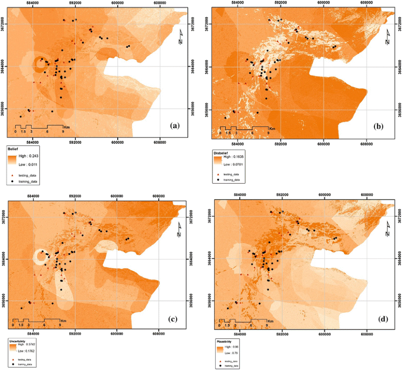 The Dempster–Shafer theory (DST) of evidence (also known as evidential belief functions EBF’s) is a generalization of the Bayesian theory of subjective probability. It has a relative flexibility to accept uncertainty and the ability to combining beliefs from multiple source of evidence (Thiam 2005). In Earth sciences, the application of this method is still limited. This method has been used for mineral potential mapping (Moon 1990; An et al. 1992; Carranza and Hale 2003; Carranza et al. 2005), landslide susceptibility (Park 2011; Mohammady et al. 2012; Bui et al. 2012; Lee et al. 2012; Pourghasemi et al. 2013), and groundwater potential mapping (Nampak et al. 2014; Mojaji et al. 2014).