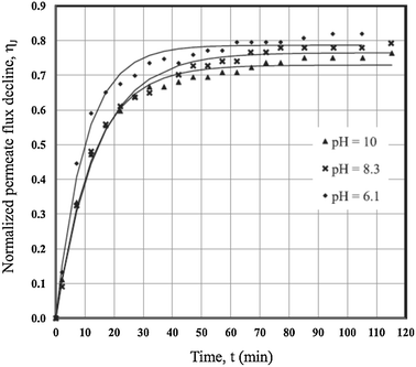 Curve fit of normalized permeate flux decline versus time (Qureshi et al. 2013)
