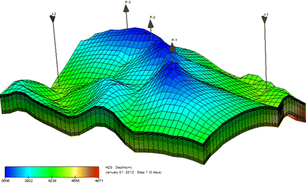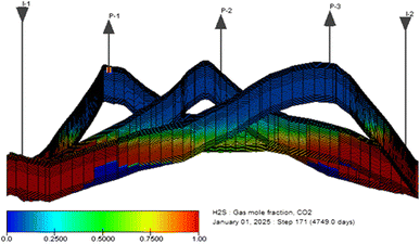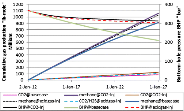 Under H2S–CO2 and pure CO2 mixing in the injection stream, the potential for EGR and storage are investigated at an injection rate of 1,250 × 100 m3/day. Under CO2 injection, slightly higher methane production is recovered because CO2 is more mobile (less viscous) compared to H2S in forming water. Therefore, pure CO2 injection is expected to rise to the upper layers more quickly than impure CO2 injection. In this instance, the injected gases are expected to overrun native gases in the production wells faster. Although, this scenario will affect sweep efficiency at some time, to that stage reservoir re-pressurization will occur faster.