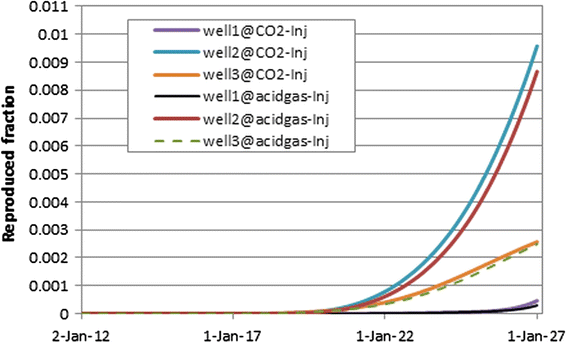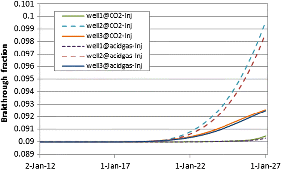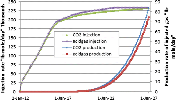 Furthermore, CO2 and CO2–H2S storage is evaluated after breakthrough is illustrated for both scenarios in terms of the produced fraction of injected CO2 and H2S–CO2 after allowing for the initial gas reservoir conditions. After estimating the produced fraction of the injected gas for both cases, production rates of the injected gas are calculated by multiplying the produced fraction of the injected gas from each well by production rate of CO2 or H2S–CO2 (at the same time during the injection). Additionally, the total production rates of injected CO2 or H2S–CO2 are compared, after allowing for the injection rate under alternative storage scenarios. Figure 5 shows that pure CO2 injection leads to greater production rates of injected gas when compared to acid gas injection scenario. In addition, during the CO2 injection process some of the injected CO2 dissolves in the formation of water. Finally, acid gas injection because of favourable H2S solubility requires smaller volumes of injected gas to be available in the gas reservoir to mix. This will lead to delay breakthrough and results in more storage.