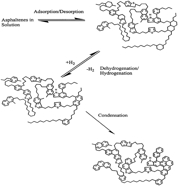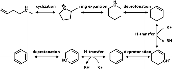 | Condensation of mono-, di-, and tri-aromatics to poly-aromatics | Ar-CHCH2 + R1CH–CHR2 → Ar − Ar + H2 |