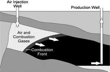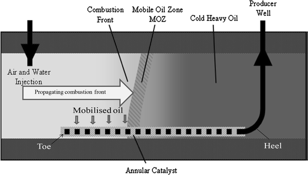 The process commences by burning a small fraction of the oil in the reservoir, thereby releasing high temperature oxidation (HTO) energy from the combustion reaction between the injected enriched air and hydrocarbons. The continuous air injection propagates the combustion front from the toe-position to the heel of the horizontal producer well, as illustrated in Fig. 2 (Greaves and Xia 2004). As shown in Fig. 2, the mobilised oil ahead of the combustion front flow short-distance downstream by gravity into the horizontal producer well.