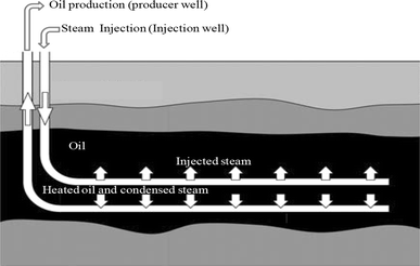 In this paper, heavy and extra-heavy oils are collectively called heavy oil. As there is no clear distinction between heavy crude oils, as they are generally characterised by their poor fluidity due to their high viscosity at reservoir temperatures and low API gravity. Therefore, owing to their high viscosity and extremely low mobility, the recovery factor of heavy oil by primary recovery method which depends on the pressure within the oil reservoir to be greater than hydrostatic pressure to drive the fluids to the production well is low, about 5 % original oil in place (OOIP) is recoverable. Also, secondary recovery methods such water flooding to maintain pressure and push the oil forward can achieve 10–20 % OOIP. In the view of this, tertiary oil recovery (i.e. enhanced oil recovery, EOR) techniques are required to improve production from the early phase. The low recovery factor of primary and secondary methods arises from their low sweep efficiency at the macroscopic level as the viscosity of the heavy oil is far greater than the viscosity of water (i.e. viscous fingering) and the low displacement efficiency at the pores matrix due to capillary forces that trap the oil (Bartel et al. 2007). In such situation, the effective and economical means of recovering heavy oil is by significant viscosity reduction via solvent dilution or heating.