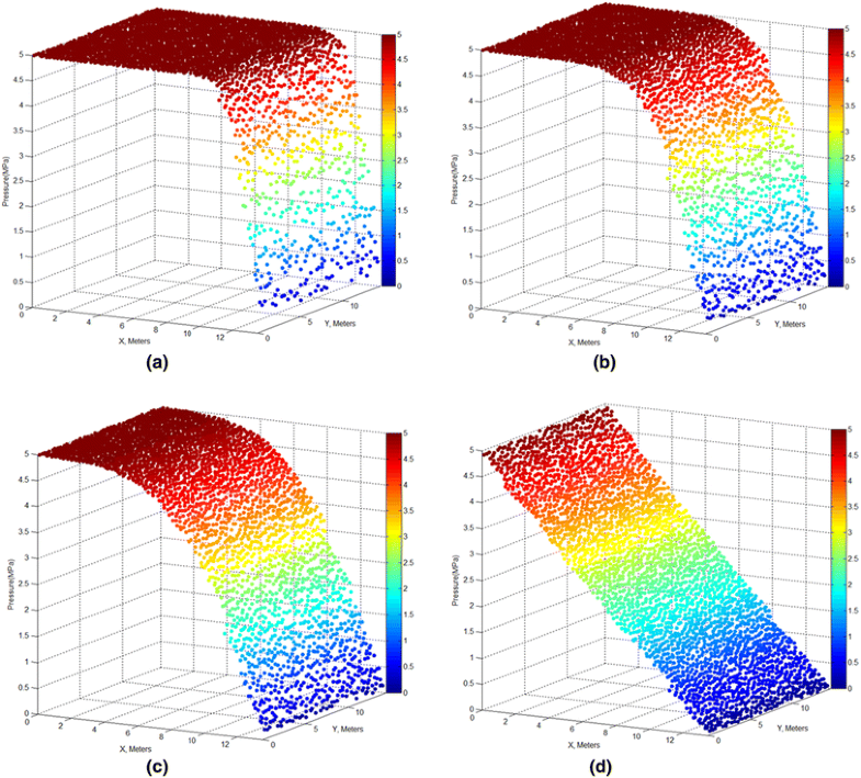 Three-dimensional view of reservoir pressure at different times. Each circle shows its domain pressure. a 207.67 s, b 825.19 s, c 2266.46 s, d 5354.02 s, e 17,704.28 s and f 38,287.82 s. Pressure in fractures dropped at quicker rate with respect to pressure in the rock matrix