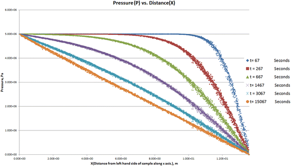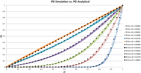 Simulated versus analytical results. Vertical axis shows dimensionless pressure and horizontal axis shows dimensionless position. On each curve, coloured dots are simulation results and black dots are analytical results