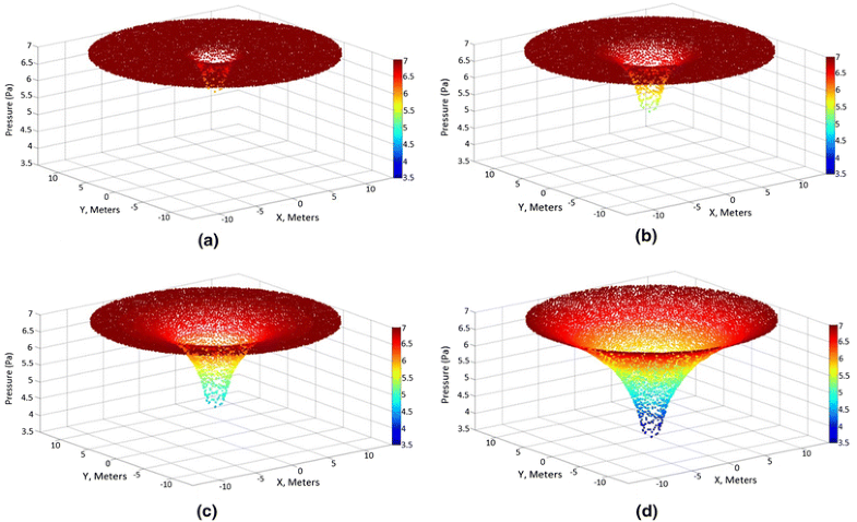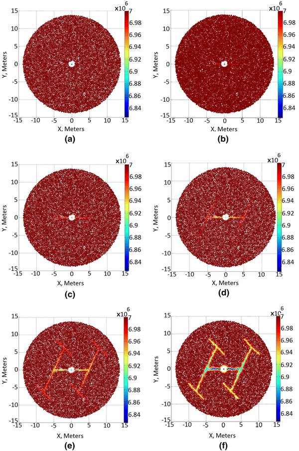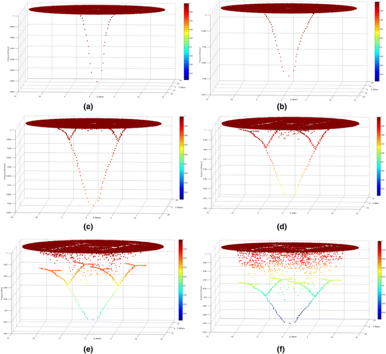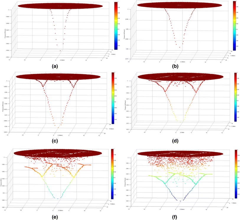 Two dimensional view of reservoir pressure at different times. Each circle shows its domain pressure. a 207.67 s, b 825.19 s, c 2266.46 s, d 5354.02 s, e 17,704.28 s and f 38,287.82 s