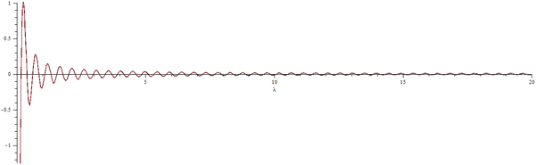 \([Y_{1} \left( \lambda \right)J_{0} \left( {\lambda R_{De} } \right) - J_{1} \left( \lambda \right)Y_{0} \left( {\lambda R_{De} } \right)]\) vs. \(\lambda\). The function approaches Zero very quickly as the value of λ increases