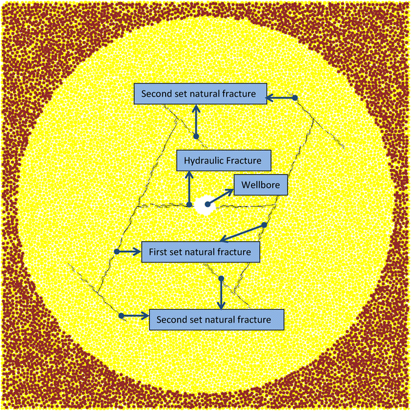 Reservoir with wellbore at centre, a bi-wing hydraulic fracture and two sets of natural fractures. Brown circles show the reservoir pressure at distances greater than external radius