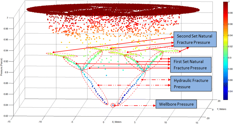 Three-dimensional view of reservoir pressure at time t = 38,287.82 s. Pressure in fractures is dropped at a fast rate