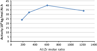 A plot of Al/Ni ratio versus the catalytic activity of catalyst 2 at ethylene pressure of 10 bars, polymerization time 1 h and temperature 24 °C