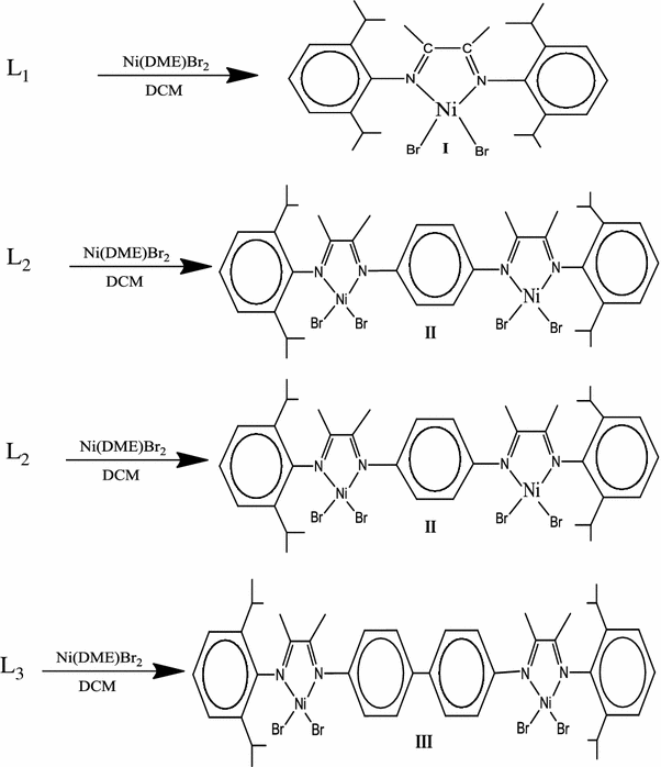 Bi-nickel-center catalysts were prepared by Schiff-base condensation of 2,3-butanedione with 2,6-di-isopropylaniline; 2-5-butylaniline, 2-isopropylaniline and 1,4-phenylene diamine(I). More Schiff-base ligands were prepared by condensation of 2,3-butandione with 2,6-diisopropylaniline; 2,4-6-trimethyl aniline and 4,4-diaminophenyl (benzidine)(II), and subsequent metathesis reaction with (DME)NiBr2. Bis(alpha diimine)nickel(II)dibromide complexes are suitable catalysts and are precursors for the polymerization of ethylene after activation with methylaluminoxane (MAO). In comparison with these complex analogs, mono-nickel-center catalysts, the new catalysts have much bigger molecules, illustrated by the distance between every two active centers (II and III). For bi-nickel-center catalysts, the catalyst’s structural credibility had profound influence on the catalytic activity. When the substituent was diisopropyl; t-butyl or methyl, the catalysts demonstrated much higher catalytic activity than the corresponding mono-nickel-center catalysts. Catalyst (II) with phenyl bridge showed high activity compared with catalyst (III) with diphenyl bridge. The catalytic properties of these complexes and the character of the obtained polymers depend on the ligand structure of the used catalysts. Substituents on the arene moiety and/or the backbone of the ligand influence the polymerization reaction. Small aryl substituents result in the formation of low molecular weight oligomers, whereas bulky aryl substituents gave high molecular weight polyethylene. Catalysts are cheap and can be prepared easily with available starting material and stable in air. The effect of Al/Ni ratio, of reaction time, variation of ethylene pressure, and the effect of temperature on catalyst performance will be discussed.