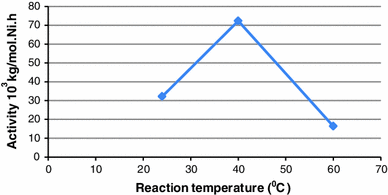 A plot of reaction temperature versus the catalytic activity of catalyst 2 at ethylene pressure of 10 bars and polymerization time 1 h