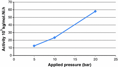 A plot of applied pressure versus the catalytic activity of catalyst 2. Polymerization time 1 h and temperature 24 °C