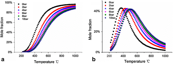 Simulated equilibrium selectivity (mole fractions) of benzene (a) and toluene (b) at varies pressures (200–1000 °C), in the case that only olefins are included in major gas hydrocarbons, only methanol is injected into the system, without N2