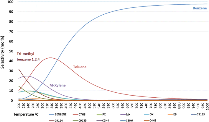 The simulated product distributions of different reactions are quite similar, showing a general trend of increasing selectivity to aromatics as the reaction temperature goes up. The single benzene ring aromatics always take the largest portion in the product, and methyl-benzenes (Toluene, xylenes and tri-methyl benzenes) reached a maximum selectivity in the temperature section of 300–400 °C, whereas benzene become predominant in the product distribution at temperatures of 400 °C and above.