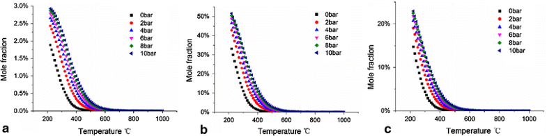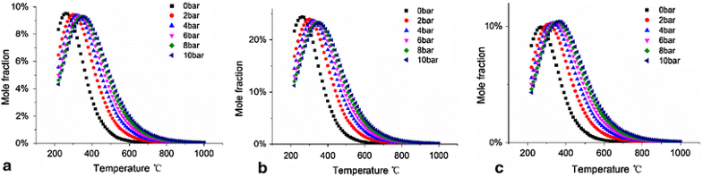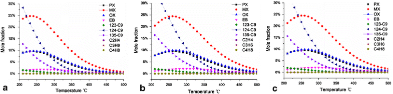 Simulated equilibrium selectivity (mole fractions) of P-xylene (a), M-xylene (b) and O xylene (c) at varies pressures (200–1000 °C), in the case that only olefins are included in major gas hydrocarbons, only methanol is injected into the system, without N2