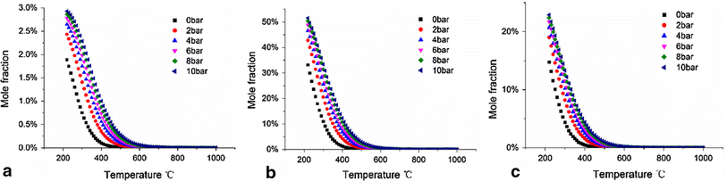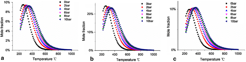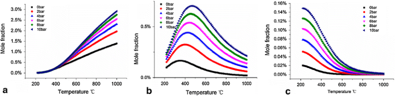 Simulated equilibrium selectivity (mole fractions) of 1,2,3-trimethyl-benzene (a), 124-trimethyl-benzene (b) and 135-trimethyl-benzene (c) at varies pressures (200–1000 °C), in the case that only olefins are included in major gas hydrocarbons, only methanol is injected into the system, without N2