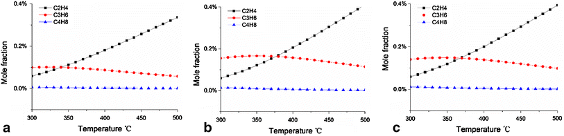 Mole fractions of major olefin products, only olefins are included as the C1–C4 product in the simulation (300–500 °C); reaction conditions: a 450 °C, 6 bar pressure, methanol (mol)/N2 (mol) = 1:2, 1-butene, and n-butane; b 450 °C atm pressure, methanol (mol)/N2 (mol) = 50:1, 1-butene, and n-butane; c 400 °C atm pressure, methanol (mol)/N2 (mol) = 3:1, 1-butene, and n-butane