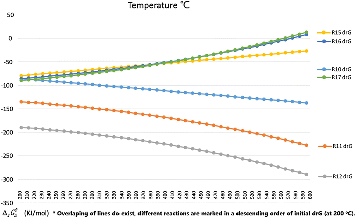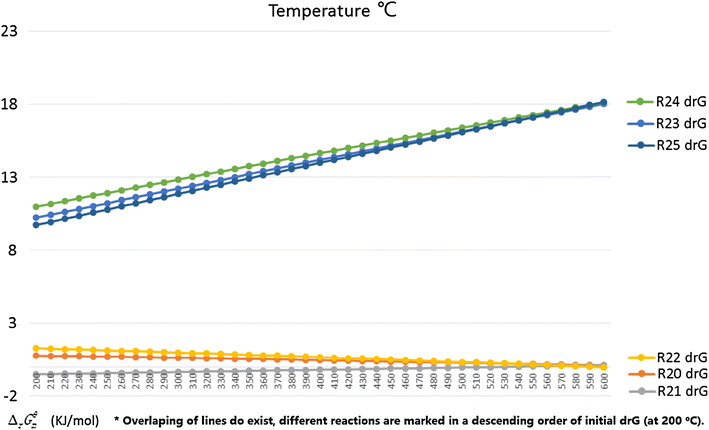 - The Gibbs free energy changes (\(\Delta_{r} G_{\text{m}}^{\theta }\)) for each sub-reaction in the temperature range of 200–1000 °C were calculated as following (1)–(5):$$\Delta_{r} H_{m}^{\theta } (298.15\,\,{\text{K}}) = \sum {\Delta_{f} H_{m}^{\theta } (298.15\,\,{\text{K}})}_{P} - \sum {\Delta_{f} H_{m}^{\theta } (298.15\,\,{\text{K}})}_{R}$$(1)$$\Delta_{r} H_{m}^{\theta } (T) = \Delta_{r} H_{m}^{\theta } (298.15\,\,{\text{K}}) + \int_{298.15}^{T} {\left[ {\sum {\left( {C_{p,m} } \right)_{P} - \sum {\left( {C_{p,m} } \right)_{R} } } } \right]{\text{d}}T}$$(2)$$\Delta_{r} S_{m}^{\theta } ( 2 9 8. 1 5 {\text{K)}} = \sum {S_{m}^{\theta } (298.15{\text{K)}}}_{P} - \sum {S_{m}^{\theta } (298.15{\text{K)}}}_{R}$$(3)$$\Delta_{r} S_{m}^{\theta } (T) = \Delta_{r} S_{m}^{\theta } (298.15{\text{K)}} + \int_{298.15}^{T} {\left( {\frac{{C_{p,m} }}{T}} \right)} {\text{d}}T$$(4)$$\Delta_{r} G_{m}^{\theta } (T) = \Delta_{r} H_{m}^{\theta } (T) - T\Delta_{r} S_{m}^{\theta } (T)$$(5)