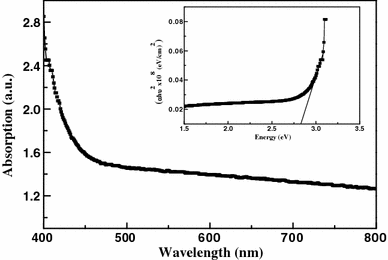 The variation of optical absorbance versus wavelength of ZnSe thin film [inset shows the variation of (αhυ)2 versus hυ to determine the band gap of ZnSe thin films]