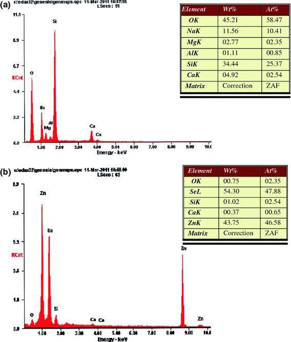 The EDX spectrum of a blank soda-lime glass and b flower-like ZnSe nanostructured thin films