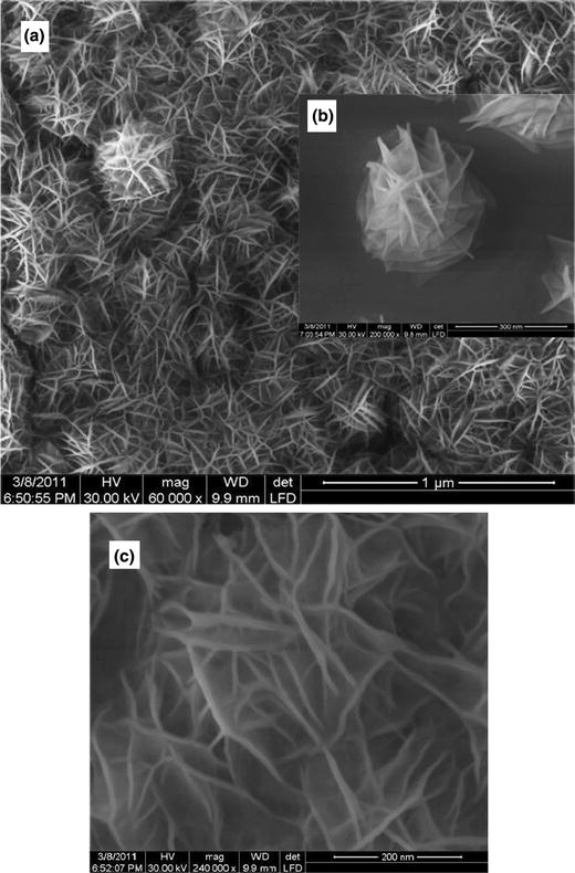 SEM image of flower-like ZnSe nanostructure a low magnification view, b, c high magnification view