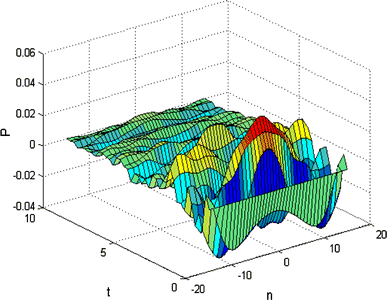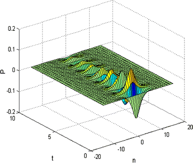 For a case with a zero field and no damping, i.e., Hamiltonian breathers, symmetric breathers are normally observed in 3D figures (not shown). It should be mentioned that in the simulation of 2D figures of polarization (P) with site index (n), i.e., distance, the peaks have been found to be symmetric Gaussian bands and even in 3D pictures the same type of symmetric bands are observed that are termed symmetric breathers. However, for a sample with poling field of 17 kV/cm with a finite value of field (E = 0.01) and a moderate damping (0.50) with low level of interaction constant (0.50), it is seen from Fig. 1 that the dissipation starts to visibly show up and the symmetric dissipative DBs are still observed. If the damping value is further increased to a high value of 0.9, the intensity almost decays to zero which is expected from dissipative breathers. With an increasing value of interaction, i.e., at a very high value of 60, it is seen from Fig. 2 that the “tri-breathers” are formed, as also observed in the case of lithium niobate (Giri et al. 2011b). It should be mentioned that the 3D diagrams (Figs. 1, 2) are very similar with those shown in Biswas et al. (2011b) with lower poling field value, as the difference between the nonlinearity parameters (513 and 421, respectively), is not as significant as in this analysis.