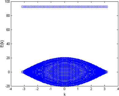 Eigenspectrum for a coupling value of \( \bar{k} = 10 \), for a low poling field Ec = 1.6 kV/cm and \( \bar{\alpha } = 4 ,427 \). The continuum represents single-phonon continua and the quantum breather band or two-phonon bound state is in the upper branch of the spectrum. Here, all the data are dimensionless