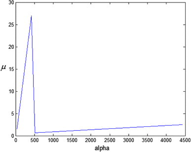Variation of the hopping coefficient (μ) in eV that is calculated from Eq. (12) is shown against nonlinearity (dimensionless) in lithium tantalate for a constant coupling of 10. It shows a sharp transition for \( \bar{\alpha } = 421 \) (Ec = 17 kV/cm)