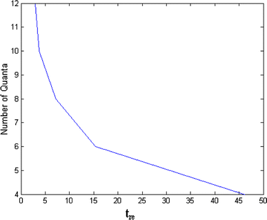 Number of quanta against the time of redistribution data showing a continuous decrease of this critical time that is proportional to QB’s lifetime with the increase of number of quanta. The x-axis has to be multiplied by 3.048 to get fs