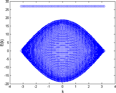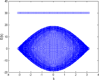 The eigenspectra showing TPBS in lithium tantalate are shown in Figs. 3, 4, 5, 6 for a poling field value of 1.60, 13.90, 17 and 210 kV/cm, respectively. The coupling value is taken as constant at 10 for all the spectra. The Landau parameter (α) is inversely proportional to the impurity content or poling field. These data along with those of TPBS parameters are shown in Table 1. In the absence of the impurity data, we would operate through Landau coefficient (read, nonlinearity) which should also give a correct picture of QBs in terms of various TPBS parameters, as nonlinearity and discreteness give rise to quantum localization or rather to the formation of QBs.