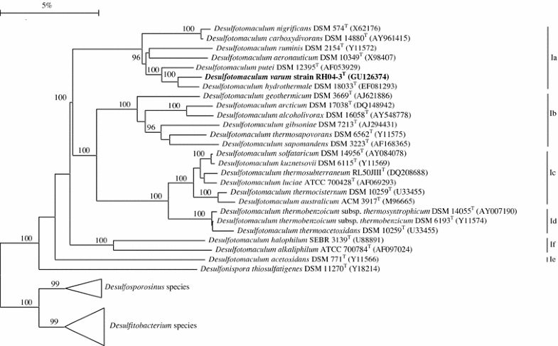 A dendrogram of the phylogenetic position of Desulfotomaculum varum strain RH04-3T and its closest relatives. Desulfotomaculum clusters Ia to If. Triangles indicate outgroups and include: Desulfosporosinus meridiei DSM 13257T (AF076527), Desulfosporosinus auripigmenti DSM 13351T (AJ493051) and Desulfosporosinusorientis DSM 765T (Y11570) representing members of the genus Desulfosporosinus, and Desulfitobacterium metallireducens DSM 15288T (AF297871), Desulfitobacterium dehalogenans DSM 9161T (L28946), Desulfitobacteriumchlororespirans DSM 11544T (U68528) and Desulfitobacterium hafniense DSM 10664T (U40078) representing members of the genus Desulfitobacterium. The scale bar indicates five nucleotide changes per 100 nucleotides, bootstrap values >95 are shown and GenBank accession numbers are given in parentheses
