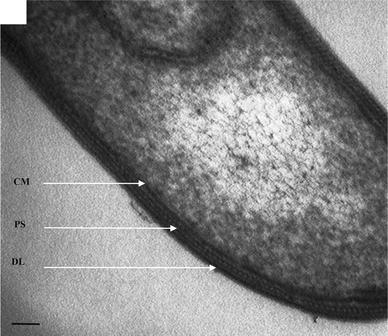 Transmission electron micrographs of a thin section of cells of strain RH04-3T showing electron-dense protein subunits (PS) situated between an electron-dense cell membrane (CM) and an outer diffused layer (DL), typical of a Gram-positive cell wall ultrastructure. Bar 50 nm