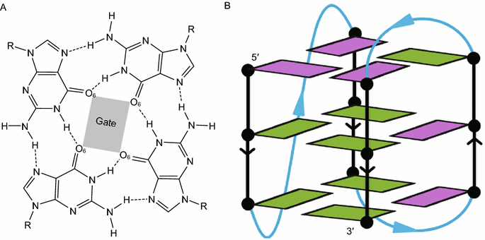 Structure of human telomeric hybrid [3 + 1] form-one G-quadruplex. (A) Top view of the top G-tetrad layer, Hoogsteen hydrogen bonds were denoted as dot lines; (B) side view of the whole schematic structure of G-quadruplex