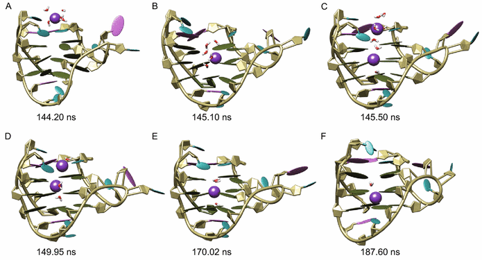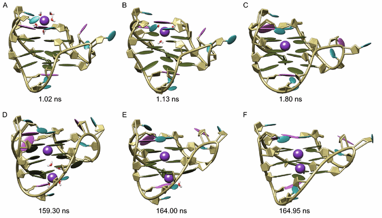 Binding process of potassium ions with human telomeric hybrid [3 + 1] form-one G-quadruplex in sim-K2. The bases of adenine, thymine and guanine nucleotides were colored orchid, cyan and olive green, respectively; potassium ions were represented as sphere and colored purple