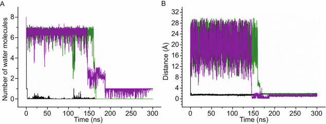 The variations of coordinated waters and distances in sim-K1 and sim-K2. For clarity, curves were smoothed by the adjacent-averaging method with a window of 10 points. (A) The number of waters within 3.5 Å of binding potassium ions; (B) the distances between the bound potassium ions and CCG. The variations in sim-K1 corresponding to the top and bottom pathway binding processes were respectively colored black and green, the variations in sim-K2 corresponding to the top pathway binding processes were colored purple