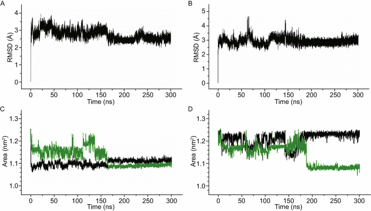 The RMSDs and the fluctuations of G-tetrad gate areas. (A and B) represent the RMSDs of sim-K1 and sim-K2, respectively; (C and D) represent the fluctuations of G-tetrad gate areas, in which the top and bottom gate area were shown as black and green lines, respectively