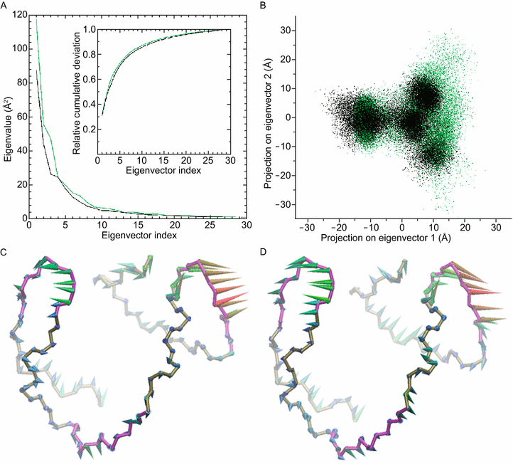 Principal component analysis. (A) Eigenvalue profiles constructed by the first 30 eigenvectors from PCA analysis of sim-K1 and sim-K2, which were represented by black and green lines, respectively. (B) two-dimensional projection of backbone atomic trajectories along the first two eigenvectors, projections in sim-K1 and sim-K2 were represented by black and green dots, respectively. (C and D) respectively show the dominant motions along the first eigenvector in sim-K1 and sim-K2 by porcupine plot