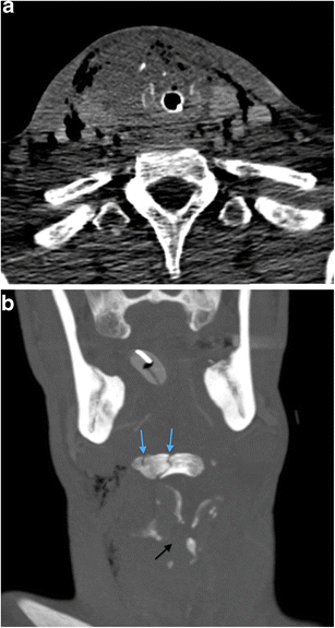 a Axial MDCTA image of a 38-year-old man who sustained a sharp penetrating injury to the midline zone 2 of the neck with a broken bottle (“glassing”). This particular mechanism is typically a combination of sharp penetrating and blunt laryngeal trauma. There is marked endolaryngeal, extralaryngeal and thyroid parenchymal haematoma, particularly on the right. Soft tissue emphysema can be seen outlining the pretracheal fascia which binds the thyroid gland. Further extensive soft tissue emphysema was demonstrated outlining the other deep cervical fascial layers, including the investing layer, the carotid sheath and the prevertebral/alar fascia layer (images not shown). Such extensive soft tissue emphysema should raise significant concern radiologically and clinically for penetration or perforation of the larynx. The patient has been successfully intubated. b Coronal-reformatted MDCTA image of the same patient as in a. Comminuted fracture disruption of the hyoid bone (blue arrows) and comminuted fracture-subluxation of the laryngeal cartilage (black arrow) are evident