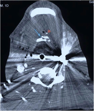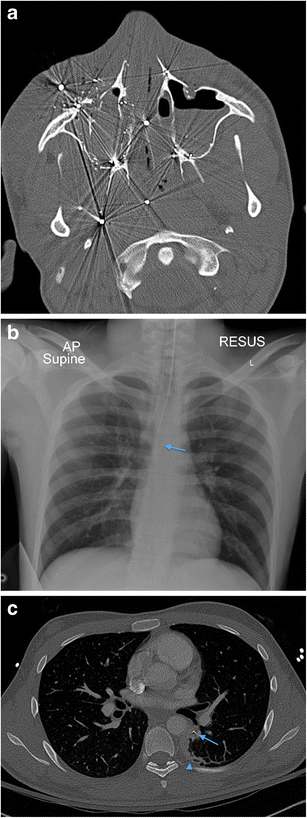a Axial non-contrast CT face image in a 19-year-old male victim of a shotgun injury to the orbito-facial region. Multiple shotgun pellets are identified in the malar soft tissues, nasal fossae, maxillary sinuses, nasopharynx and masticator space, particularly on the right at this axial level. Fracture fragmentation of the right maxillary sinus, malar and retroantral haematoma and antral haemorrhagic fluid are present. The involvement of the nasal, nasopharyngeal and oral (the latter not shown) airway raises potential for distal migration of pellets (as well as of in-driven tissue fragments) through the upper aerodigestive tract into the lower respiratory tract and gastrointestinal tract. b Plain chest radiograph in the same patient as in 13a performed during trauma survey on admission demonstrates distal migration of a shotgun pellet (blue arrow) into the mid-oesophagus (confirmed on CT chest assessment [not shown]). The patient is intubated. c Axial image of a contrast-enhanced CT thorax of the same patient as in a and b, performed 12 h later also confirms aspiration of a shotgun pellet (blue arrow) associated with distal subsegmental left lower lobe atelectasis (blue arrowhead). There had also been further distal intra-oesophageal migration of the mid-oesophageal shotgun pellet (image not shown)