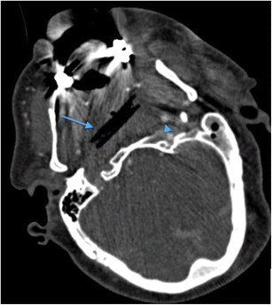 Axial MDCTA image through the infratemporal fossa of a 59-year-old man who fell on to a garden bamboo stick (thin blue arrow) which penetrated the left buccal region of the facial soft tissues, lodging and breaking-off in the retropharyngeal region of the nasopharynx and causing dissection occlusion of the right internal carotid artery (note the normal contralateral left internal carotid artery [blue arrowhead]). The geometric margin of the air-containing abnormality highlights the radiologic features consistent with an embedded foreign body fragment of organic material (wood). The patient subsequently developed a near-total thromboembolic right middle cerebral artery territory infarct (imaging not shown)