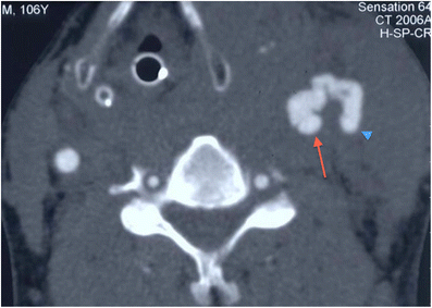 Axial image of MDCTA in an adult male patient who sustained a penetrating stab wound to the left zone 2 of the neck demonstrates a resultant traumatic left arteriovenous fistula between the left common carotid artery (red arrow) and adjacent internal jugular vein (blue arrowhead). It was subsequently closed through radiological intervention. Note the haematoma affecting the overlying left sternocleidomastoid muscle parenchyma and the large haematoma and oedema in the left parapharyngeal and extralaryngeal soft tissues causing mass effect and significant displacement of the laryngopharynx to the contralateral side. The patient is intubated. (The authors’ departmental protocol is to arbitrarily register the year of birth for any adult patient who is unconscious or intubated and ventilated, where details are unavailable, as 1900 in the acute admission situation—the patient’s age has therefore been “erroneously” calculated as 106 years by the scanner as shown in the top right-hand corner of this image)