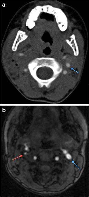 a Axial MDCTA image of a 9-year-old patient who sustained accidental penetrating injury by a wooden stick to zone 2 of the right neck. The stick was removed at the time of the injury by the patient’s friend but there is dissection occlusion of the right internal carotid artery; only the external carotid artery, one of its branches and the vertebral artery are visible on this side. The normal left internal carotid artery is annotated for comparison (blue arrow). The patient escaped any significant complicating cerebrovascular ischaemic event. b Axial source image of two-dimensional time of flight MR angiogram of the same patient as in a, performed 4 years later as part of follow-up assessment. The previously injured right internal carotid artery has re-canalised (in keeping with the natural history of dissection injury) but exhibits residual focal stenosis (red arrow) compared with the normal contralateral left internal carotid artery (blue arrow)
