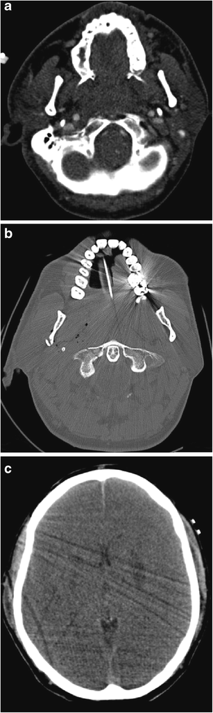 a Axial MDCTA image through the junction of the nasopharynx with the oropharynx (above the level of the endotracheal tube) in a 43-year-old man who sustained fatal perforating gunshot injury to the neck, which entered in the left zone 3 and exited through the right zone 2, having traversed the posterior oropharynx (image not shown). The pharyngeal airway at the level shown has been completely obliterated by haematoma and oedema. Pharyngeal projectile penetrating injuries, in the absence of major vascular injury, are frequently fatal due to airway compromise from haematoma, oedematous swelling and haemorrhagic debris. b Axial CT image of the same patient as in 8a on bone-window settings through the superior oropharynx (slightly inferior to the level in a). There is fracture disruption of the right lateral mass of the atlas (C1) at the junction with the anterior arch as well as fracture of the posterior aspect of the right ramus of the mandible cause by the bullet (which exited through zone 2 on this side). Soft tissue emphysema and swelling is evident in the right prevertebral, parapahryngeal and masticator spaces. The endotracheal tube is demonstrated. c Non-contrast CT brain of the same patient as in a and b performed 2 days later, demonstrating severe generalised hypoxic ischaemic encephalopathy with symmetrical subacute low attenuation change identified in the basal ganglia at this level as well as evidence of significant cerebral oedema and swelling. Brain stem death was subsequently confirmed and intensive care support withdrawn