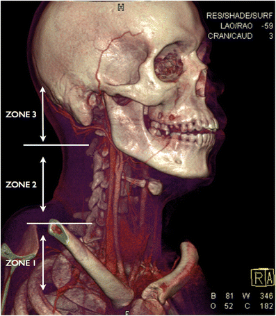 Three-dimensional volume rendering technique (3D VRT) of MDCTA performed on a young male victim of a stab wound to the neck demonstrating the anatomical trauma zones in penetrating injury of the neck. In this young patient, the cricoid cartilage has not yet calcified and therefore is not visualised on the VRT but the thyroid gland is visible (the lower border of the cricoid cartilage will be located just above the level of the isthmus of the thyroid gland)