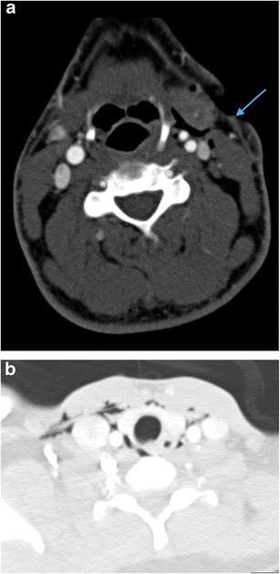 a Axial image of MDCTA performed on a 33-year-old man who sustained a stab injury to left zone 2. The platysma has been breached (arrow) and there is soft tissue emphysema in the deep cervical fascia surrounding the left carotid sheath. No major vascular injury or upper aerodigestive tract penetration was present. There was no pneumothorax. b Axial image of MDCTA through zone 1 on lung-window settings of a different patient who sustained left zone 2 penetrating knife injury with breach of platysma (image not shown). Diffuse soft tissue emphysema is noted in the deep cervical fascia bilaterally in zone 1 despite penetrating wound entry in left zone 2. This can be a common finding in penetrating neck injury where platysma has been breached even in the absence of perforation of the upper aerodigestive tract or pneumothorax. Nevertheless, penetration of the laryngopharynx should be further excluded where clinical and radiological suspicion is high. (Contrast swallow was negative in this patient)