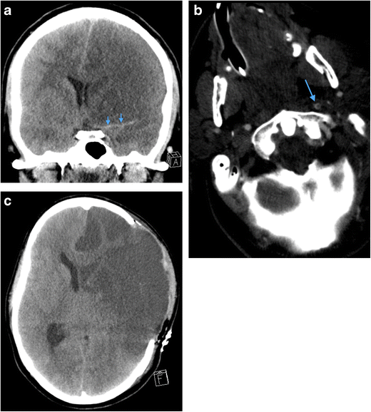 a Coronal reformatted non-contrast CT brain image of a 34-year-old man who sustained a penetrating knife injury to the left zone 2 of the neck requiring emergency surgical neck exploration prior to imaging assessment because of catastrophic haemorrhage. Therefore, pre-treatment CT and MDCTA were not performed because of the clinically evident active life-threatening haemorrhage on arrival in the emergency department. The non-contrast CT brain assessment was performed immediately prior to the post-operative MDCTA (b) and demonstrates acute thromboembolic “malignant” left anterior circulation infarction: there is already ischaemic demarcation of both the left middle and anterior cerebral artery territories with severe subfalcine herniation and midline shift; hyperdense thromboembolus is evident in the left middle cerebral artery (arrows) and proximal left anterior cerebral artery. b Axial image of MDCTA of the same patient as in a performed immediately post-operatively following internal carotid artery repair reveals a tail of extensive intraluminal thrombus extending distally from the site of vessel injury and repair (arrow). c Axial non-contrast CT brain of the same patient as in a and b performed 48 h later. The patient has undergone interval emergency left decompressive hemicraniectomy: the left anterior circulation low attenuation infarction is more established and the significant mass effect, subfalcine herniation and intracranial pressure related to swollen oedematous parenchyma have been ameliorated by hemicraniectomy. Unfortunately, brain-stem death was confirmed 12 h later