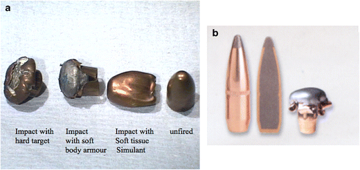In general, bullet wounds (and, in fact, any projectile wound) are more severe when the projectile yaws through tissue, when the projectile fragments or deforms (into a mushroom shape, for example), when the projectile is large, or when the projectile is travelling at high velocity [28]. One of the “recommendations” of the hollow-point and soft-point bullet (the former are used by specialist fire-arms officers in the UK) is that they are less likely to exit the target, which poses smaller risk to bystanders. This is because they exhibit significant deformation as a result of their construct, transferring most or all of their kinetic energy to the tissue and usually stopping within the body target. The lethality of the hollow-point and soft-point bullet (Fig. 4b) is therefore very high and it is for this reason that this type of ammunition is also used in hunting, supposedly expediting death of the target animal as rapidly and as humanely as possible.
