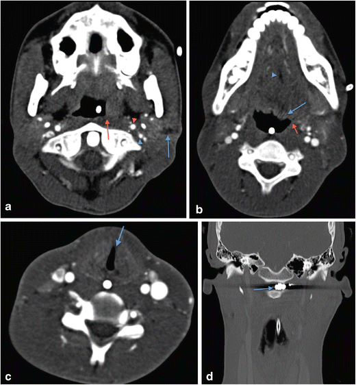 a Axial image of MDCTA of sharp (non-projectile) penetrating injury to the left zone 3. The implement bisected the left carotid sheath just below the skull base with the wound track (blue arrow) splaying the internal carotid artery (red arrowhead) from the internal jugular vein (blue arrowhead) but not causing any radiologically evident vascular injury. The patient exhibited clinical signs of Collet-Sicard syndrome—palsies of cranial nerves IX, X, XI and XII. The MDCTA demonstrates flattening of the left lateral pharyngeal recess (red arrow) compared with the contralateral side as a result of a combination of haematoma and superior pharyngeal constrictor paresis (the motor supply of the superior pharyngeal constrictor is through the motor component of the pharyngeal plexus derived from the cranial part of the accessory [XI] nerve). There is a nasogastric (NG) tube in situ. b Axial image of MDCTA of the same patient as in a showing evidence of left hypoglossal nerve palsy—there is flaccid prolapse of the tongue base (blue arrow) and deviation of the median fatty raphe to the ipsilateral side (blue arrowhead) and reduced calibre of the left glossopharyngeal sulcus (red arrow). The NG tube is noted in situ. c Axial image of MDCTA of same patient as in a and b. There is subtle medialisation of the left true vocal cord (blue arrow) consistent with a left vagus nerve palsy confirmed on flexible nasoendoscopy; this is one of the components of Collet-Sicard syndrome. The NG tube is evident in situ. d Coronal reformat of the same patient as in a, b and c. A metal fragment of the implement used to inflict the penetrating injury remains lodged in the left prevertebral soft tissues (blue arrow) having bisected the left carotid sheath and injured the adjacent cranial nerves